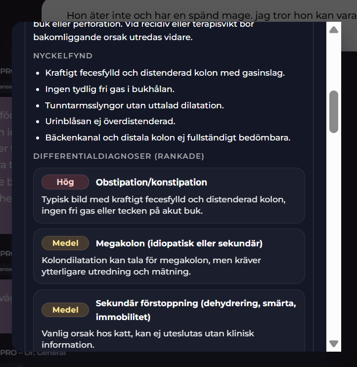 I Stetoskåpet med Visuella Fynd (Röntgen) finner du ett strukturerat remiss-svar och rekommendationer. Din AI-doktor hanterar dessa resultat och återupptar chatten med dig. Du kan när som helst klicka på olika submenyer i Steoskåpet för hela statusen i ärendet.