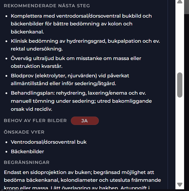 Radiologica Röntgentolk har utgått från chatt med din doktor som har en frågeställning som ska utredas. I detta exempel är det en katt som kan vara förstoppad. En komplett remiss har producerats. Remissens frågeställning tillsammans med röntgenbilder du kan ladda upp kommer att tolkas och generera ett remissvar.