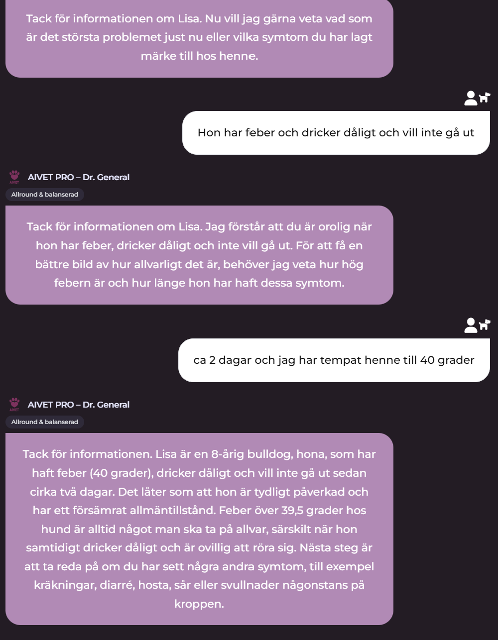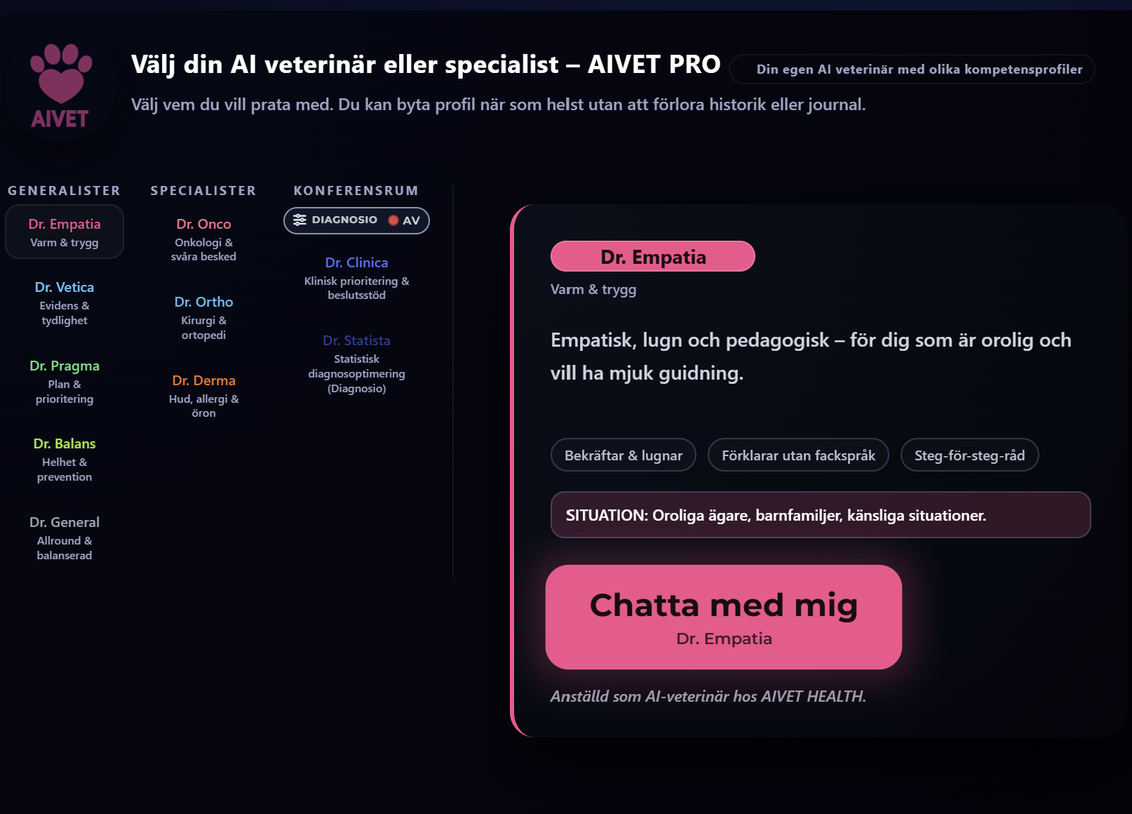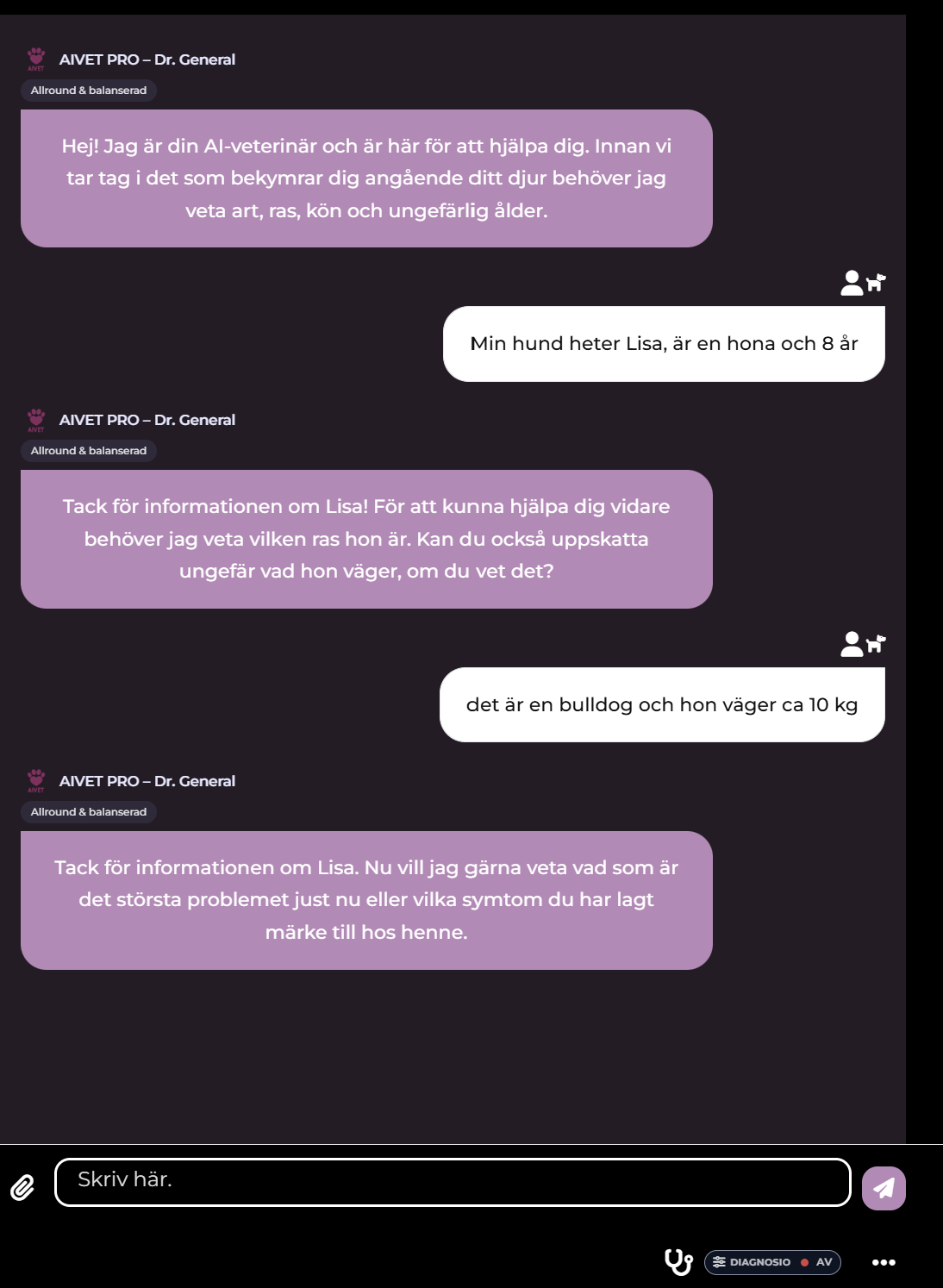 ChattenAIVET chatten är ett avancerat chatt-verktyg för dig som vill prata med en AI Expert inom djurhälsa. Det är ett utbildningsverktyg och ersätter inte veterinär. När du chattar med AIVET kommer den att föreslå vad som kan göras beroende på den information du delger i chatten. AIVET skapar anamnes, föreslår tester, diagnoser, ger rekommendationer m.m. AIVET kan användas av djurägare, veterinärer och kliniker.